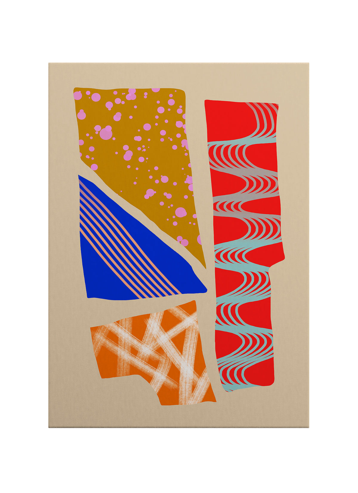 Canlı kırmızı, kobalt mavi, hardal sarısı ve turuncu tonların grafik formlarla bir araya geldiği bu eser, Bauhaus estetiğinin modern bir yorumudur. Farklı dokular, çizgisel hareketler ve ritmik tekrarlar sayesinde tablo dinamik bir görsel akış yaratır ve bulunduğu mekâna güçlü bir karakter kazandırır.