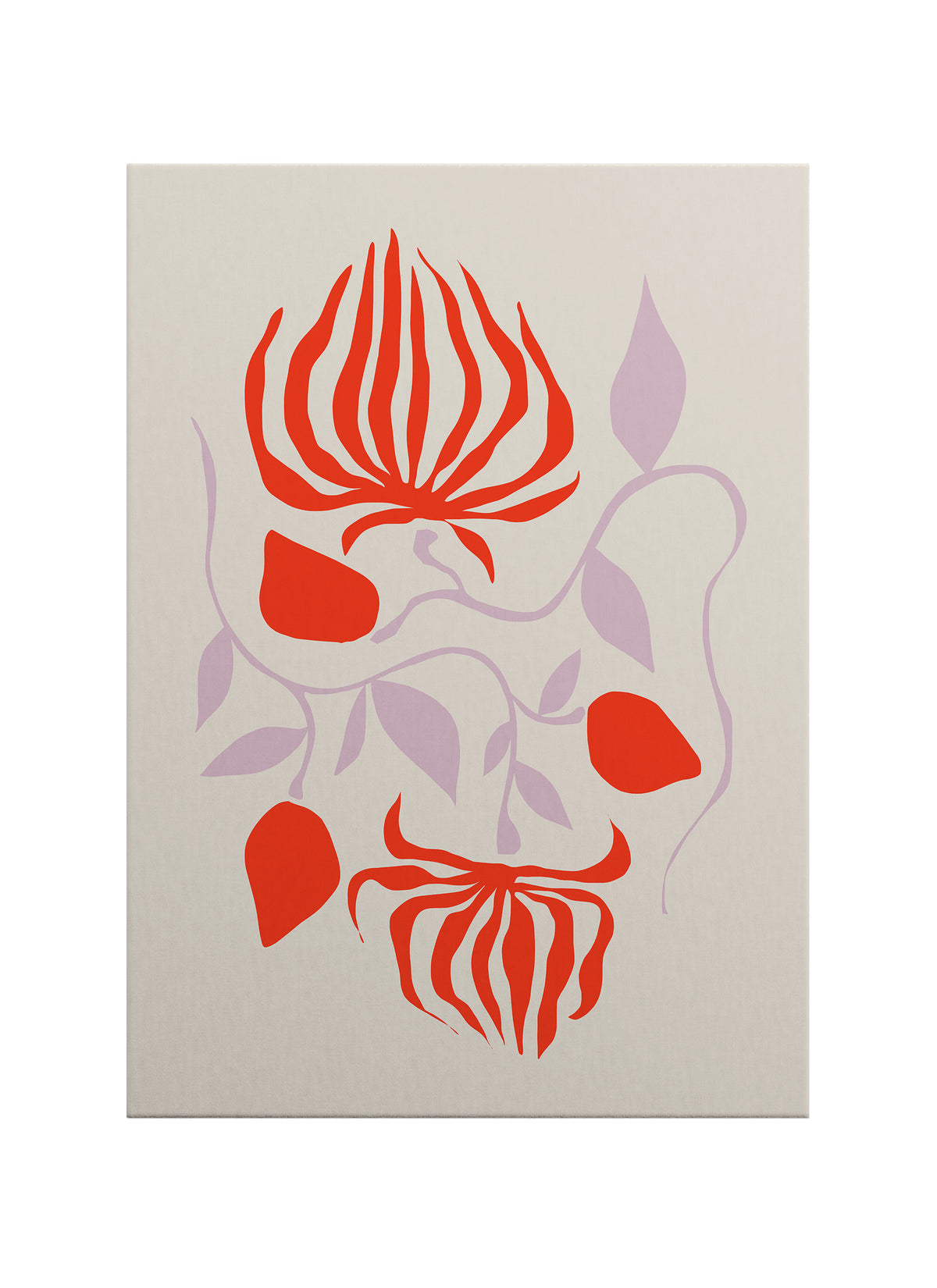 Kırmızı Lale Formları kanvas tablo, stilize çiçek çizgileri ve sade kompozisyonuyla modern botanik estetiği temsil eder. Kırmızının güçlü enerjisi ile lilanın yumuşak tonları dengelenerek hem çarpıcı hem de huzurlu bir atmosfer yaratır.