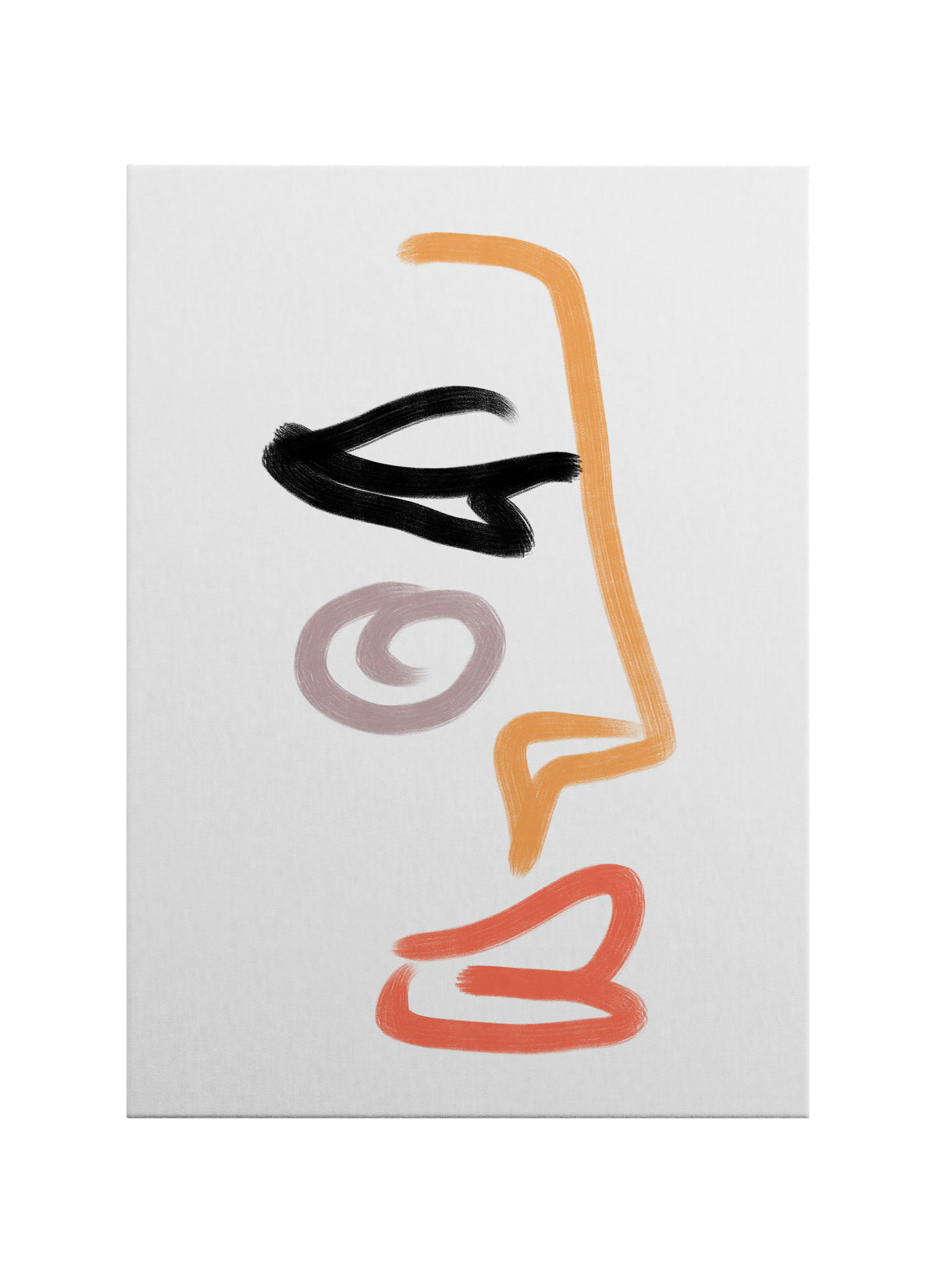 Tek bir yüzün en sade çizgilerle yeniden inşa edildiği bu eser, minimal formlarla güçlü bir ifade yaratır. Turuncu kontur, siyah göz formu ve yumuşak tonlardaki spiral detay; kimlik, iç dünya ve sessiz duygular temasını izleyiciye sezgisel bir biçimde aktarır.